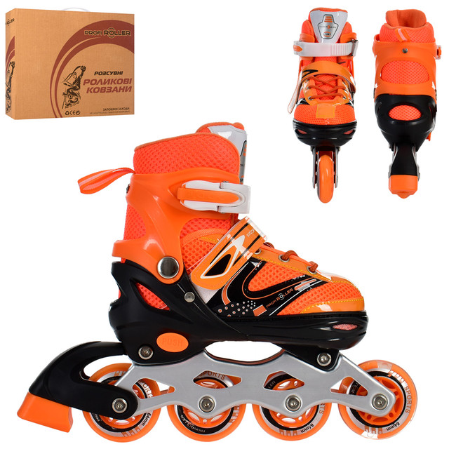 Дитячі ролики Profi A4145-S-OR розсувні — обладнані якісними поліуретановими коліщатками, розташованими в один ряд, у задній частині роликів є гальма, які допоможуть малюкові зробити зупинку.