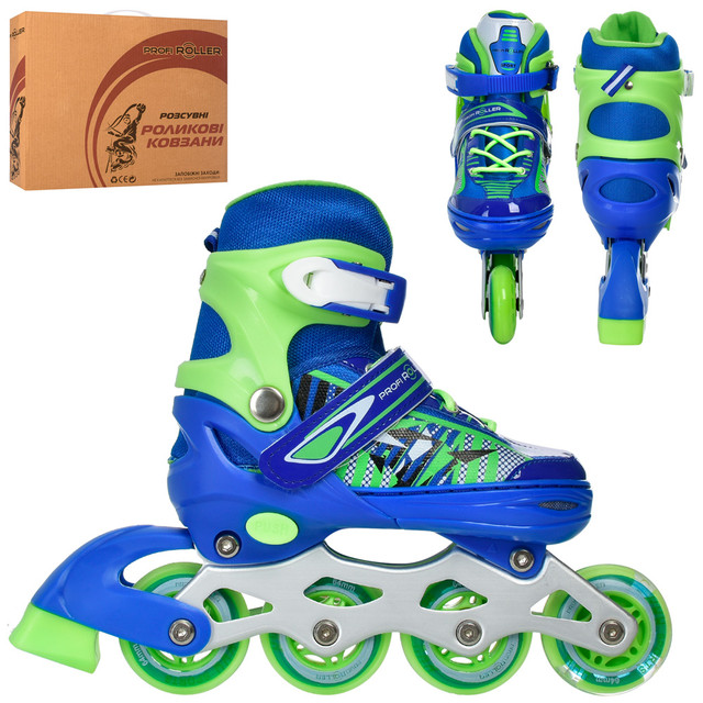 Дитячі ролики (31-34 розмір) Profi A4143-S — мають алюмінієву раму, що зменшує їхню вагу та робить їзду ще легшою, ролики розсувні завдяки цьому їх можна відрегулювати під ногу дитини, ця модель фіксується на нозі дитини за допомогою шнурівки та баклі, коліщатка виготовлені з поліуретану, що гарантує їм довгий термін експлуатації.