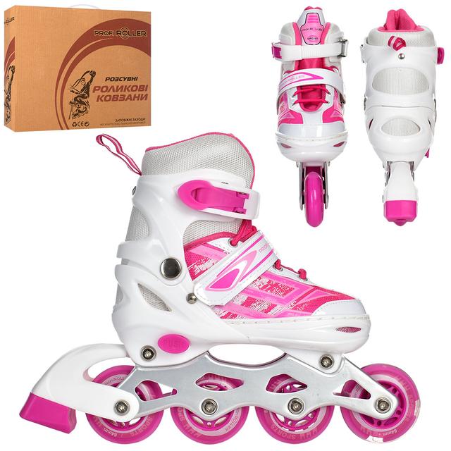 Дитячі ролики (31-34 розмір) Profi A4144-S — мають алюмінієву раму, що зменшує їхню вагу та робить їзду ще легшою, ролики розсувні завдяки цьому їх можна відрегулювати під ногу дитини, ця модель фіксується на нозі дитини за допомогою шнурівки та баклі, коліщатка виготовлені з поліуретану, що гарантує їм довгий термін експлуатації.