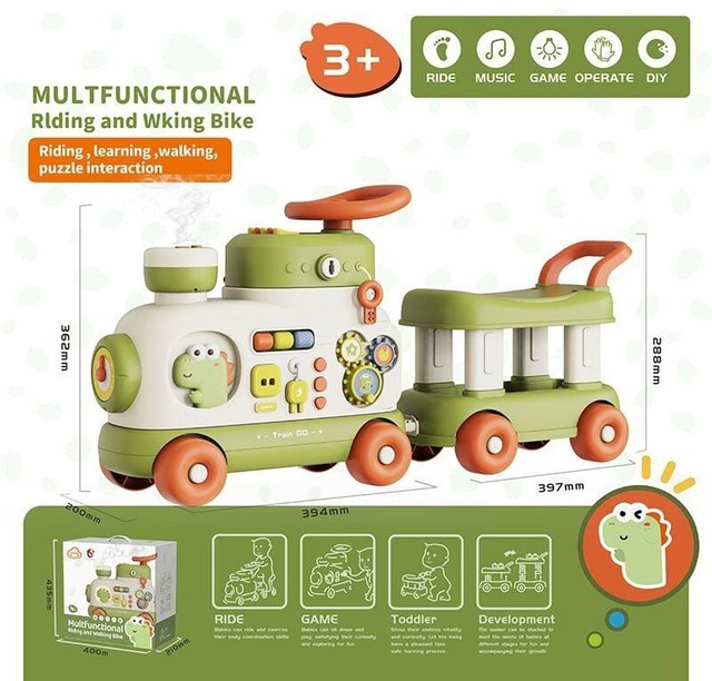 Ця яскрава мультифункціональна каталка стане чудовим подарунком кожному малюкові! Іграшка може використовуватися і як каталка, і як ходунки, які допоможуть вашим малюкам зробити її перші кроки, і навіть як невеликий толокар. Каталка стилізована під мультяшний потяг, який навіть вміє генерувати пару зі своєї труби за допомогою вбудованого парогенератора. Також іграшка не дасть дитині занудитися, адже в неї багато цікавих активностей, зокрема інтерактивний бізіборд, який реагує на дії з нею аудіо- та світловими ефектами. А невелике піаніно, яке знаходить на даху поїзда, відкриє для малюка дивовижний світ музики з ніжними мелодіями та веселими дитячими пісеньками, як він зіграє ваших малюків.